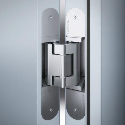 TECTUS enables the optimal integration of flush doors in straight line and flush surfaces for contemporary clean designs. The SIMONSWERK TECTUS TE 540 3D concealed hinge is completely hidden for flush doors with wood, steel or aluminum doors and frames. The three-dimensional adjustability and maintenance-free slide bearing technology of the TE 540 3D hinge system is for use with high-quality commercial doors.